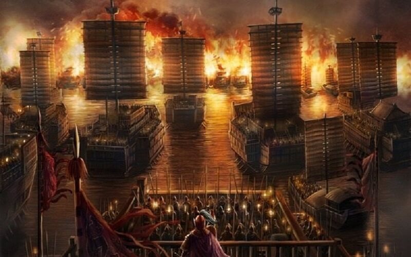Wiatr rozniósł ogień na wszystkie okręty Cao, które wciąż były połączone łańcuchami. Kiedy ponad połowa żołnierzy spłonęła lub utonęła, nastąpił atak wojsk południa.