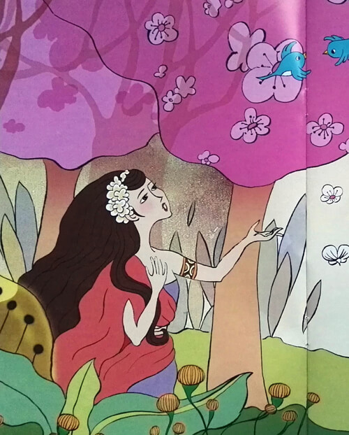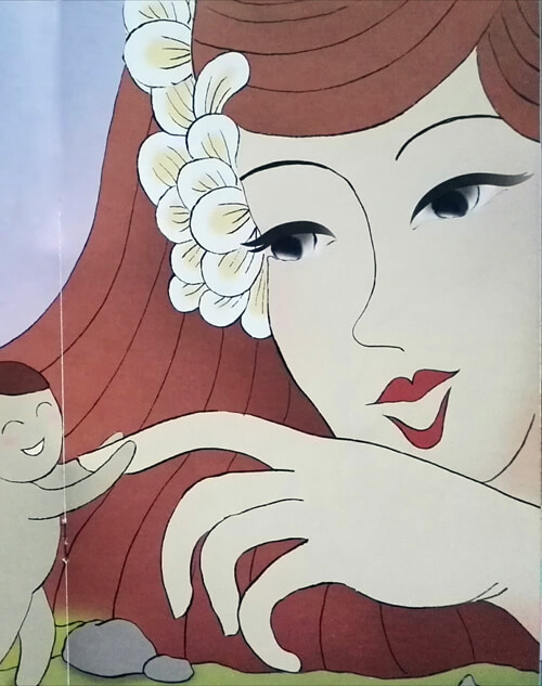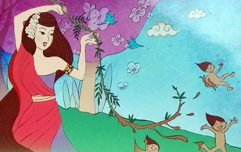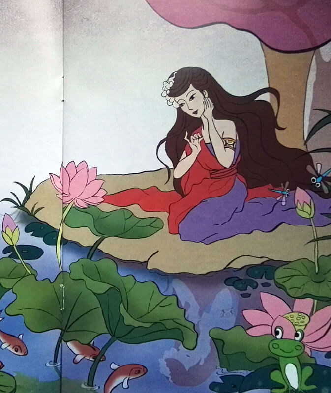 Nüwa usiadła nad stawem i przyglądała się swojemu odbiciu. W tym momencie zobaczyła jak piękne ryby goniły się pomiędzy kwiatami lotosu. To wtedy zrozumiała, że jest smutna, ponieważ jest samotna. Nie było drugiej takiej istoty jak ona.
